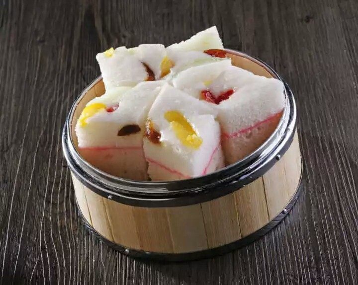 3:3.用纱布,蒸笼里把和好的迷糊倒进蒸笼,第一层有一公分厚蒸15分钟,取出来加上果酱在倒入第二层米糊,拍平放上蜜饯蒸三十分钟!