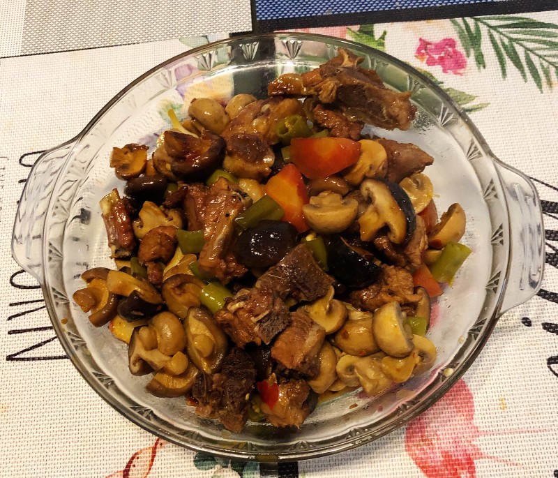 11:排骨烧了30分钟后加入三种菌菇和大蒜,烧20分钟。