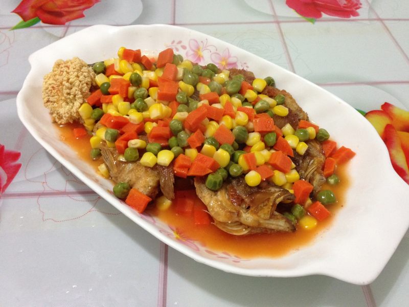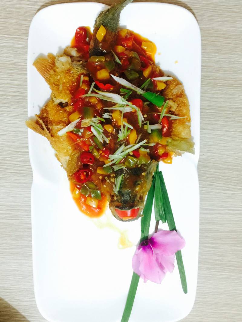 10:调好的汁勾芡后均匀的倒在鱼身上,简单摆盘装饰即可,可以上桌了!