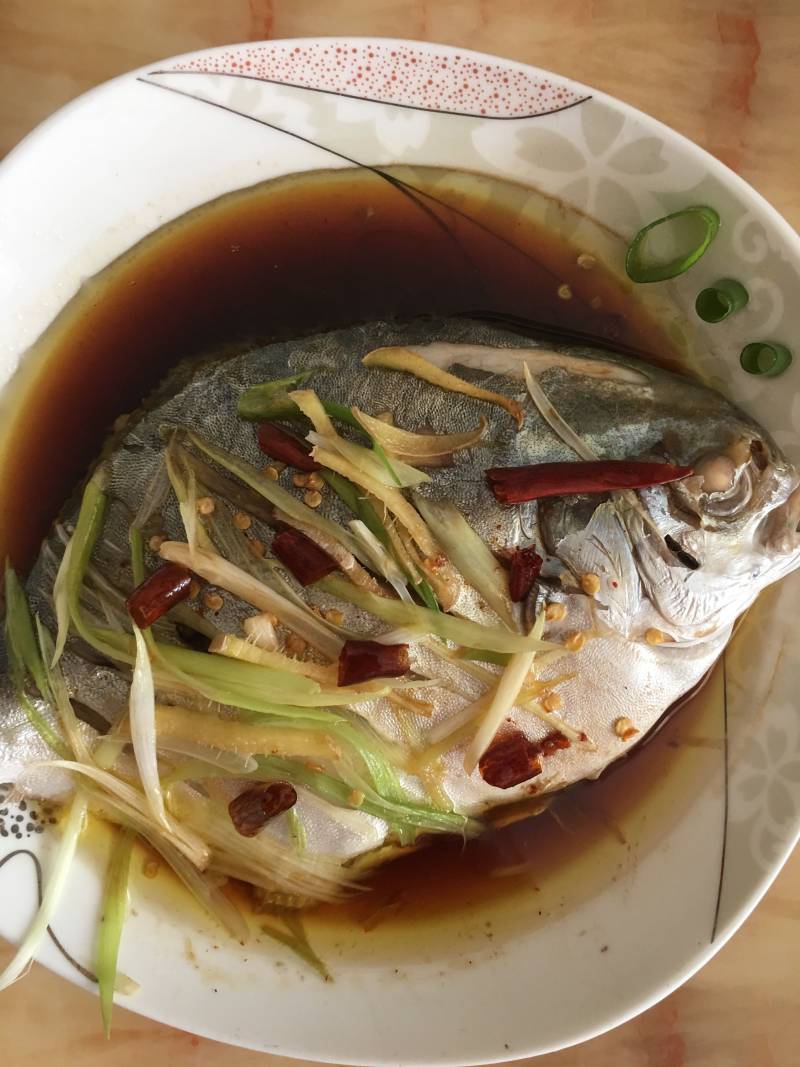 2:放蒸锅大火蒸七分倒掉汤水和葱姜蒜丝,倒入鱼豉油重新放葱姜丝和辣椒块,油锅烧热油淋上即可!