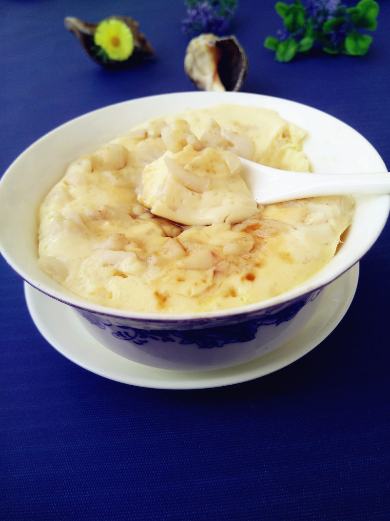 8:鱿鱼放到表面已经凝固的蛋液上,盖上盖子继续蒸,蒸熟关火。