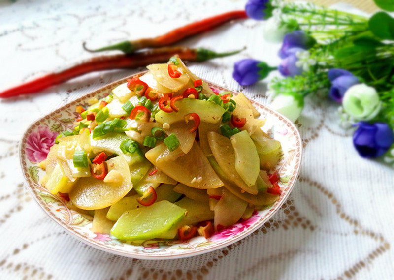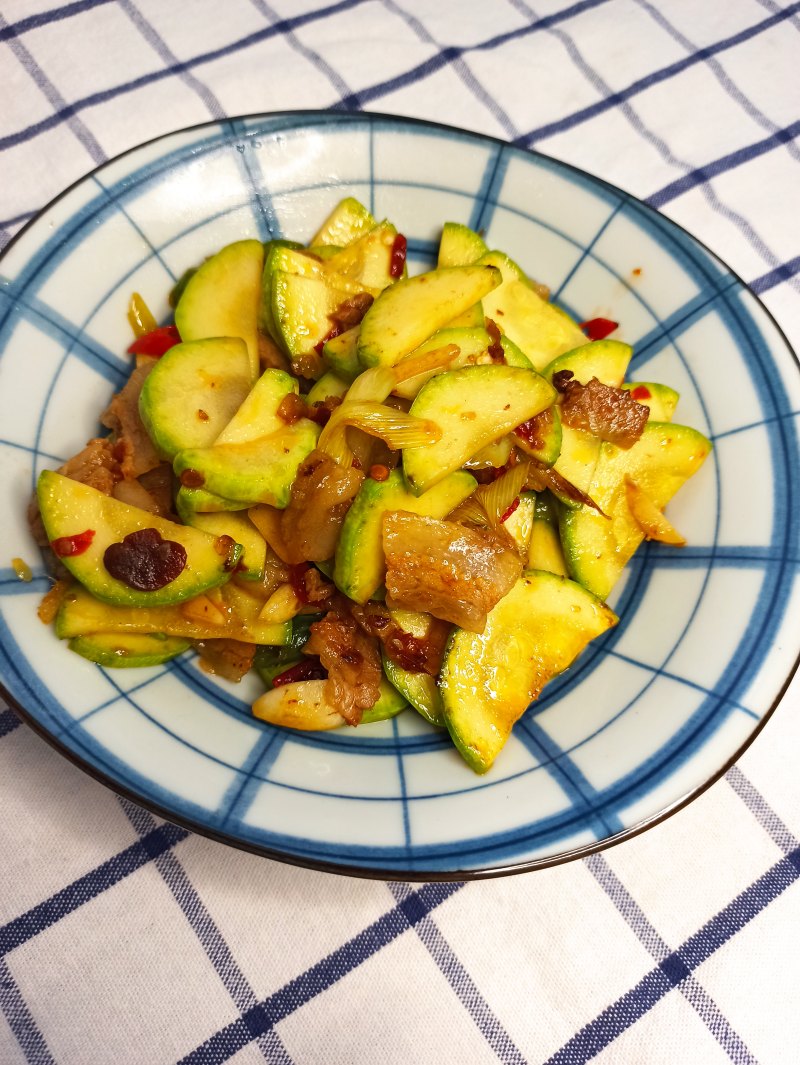 2:改大伙,下西葫芦片。爆炒2-4分钟。出锅前加入盐和生抽。盛出即可。