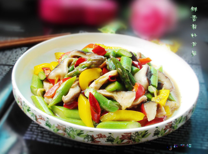 芦笋250克;鲜香菇4朵;红椒1小块;黄椒1小块;