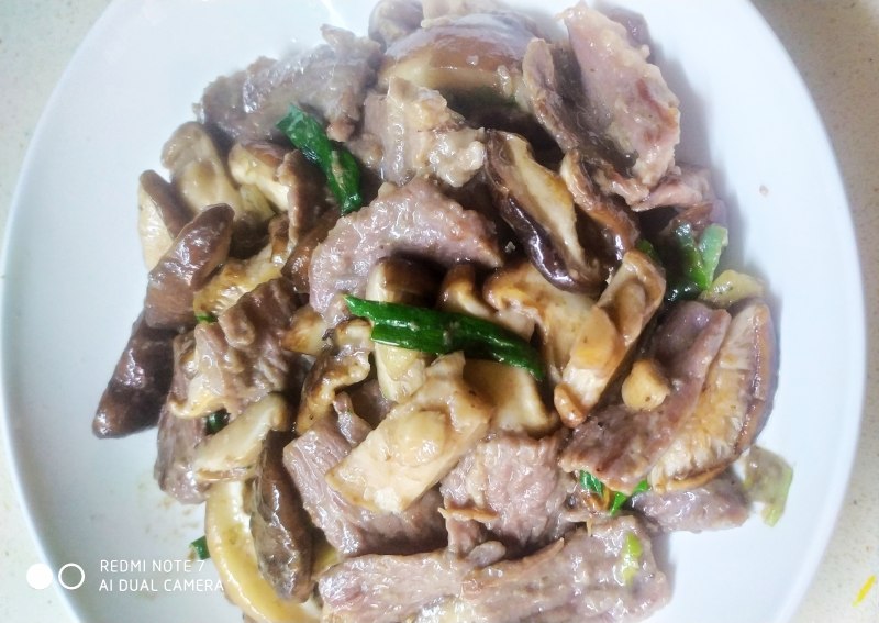 4:起油锅加入鲜香菇、盐翻炒片刻后加入肉丝再翻炒片刻