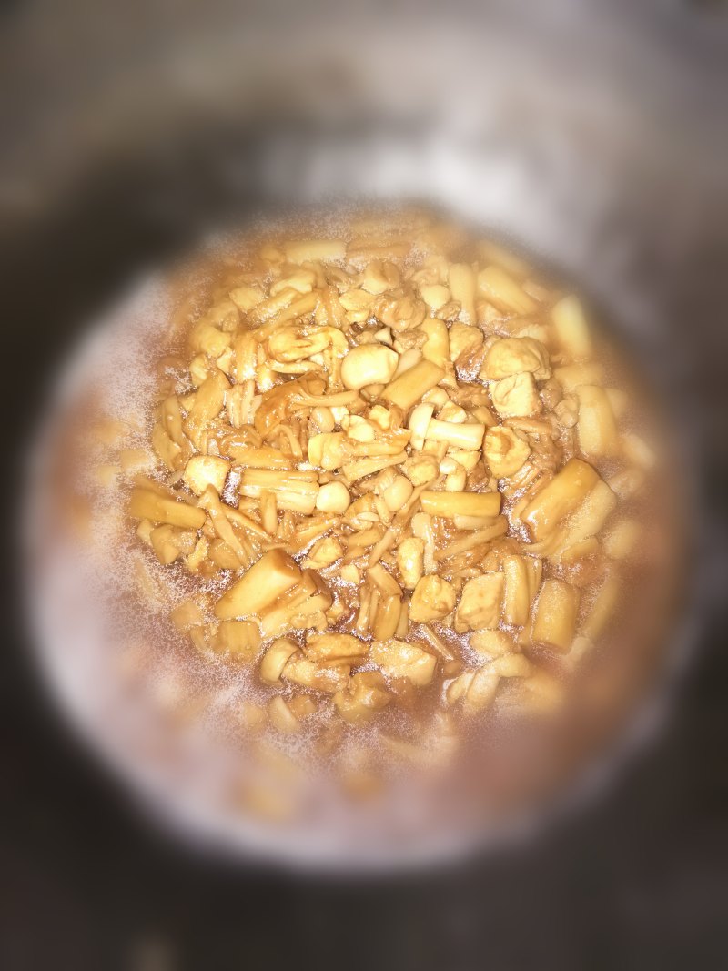 3:烧锅倒油烧热,下入切好的鲜素鸡炸一下,捞出。