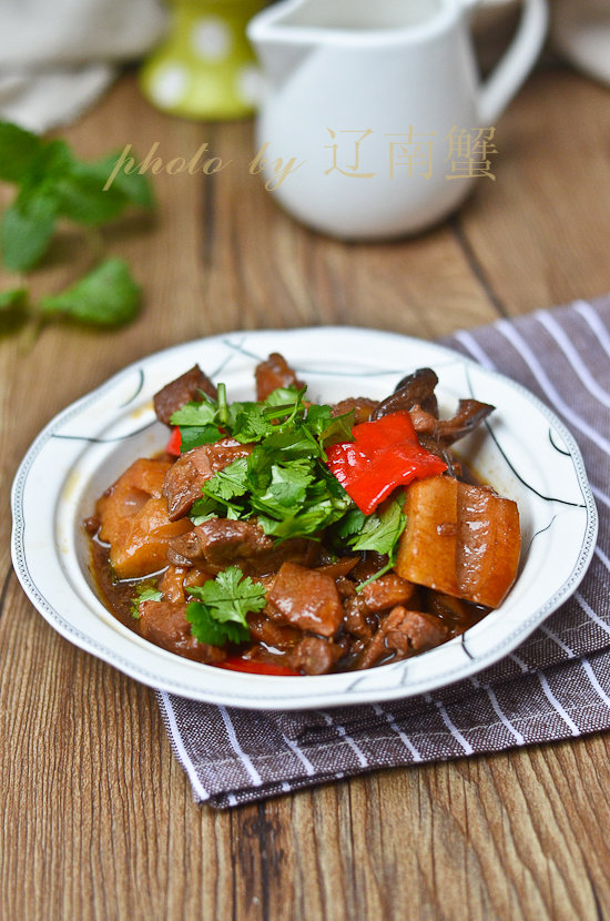 8:加入香菇翻炒一下,盖上锅盖中小火焖15分钟左右