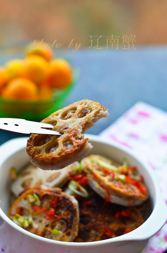 9:将全部煎好的莲藕夹回锅,加上生抽糖和一点儿高汤,加盖烧焖,出锅前放一点儿盐,上桌前可以装饰蒜苗碎和辣椒碎,一方面好看,另一方面也调整一下口味儿。