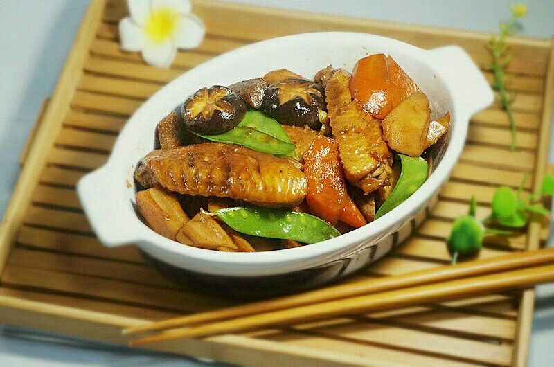 鸡中翅5个;牛蒡1段;莲藕1段;胡萝卜1段;香菇5个;荷兰豆10个;