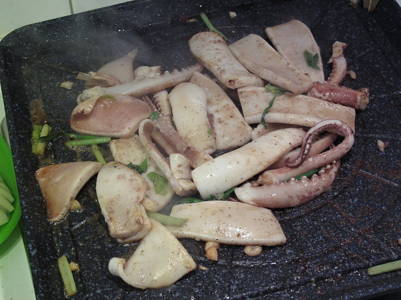 5:铁板加油烧热,倒入鱿鱼煎熟;