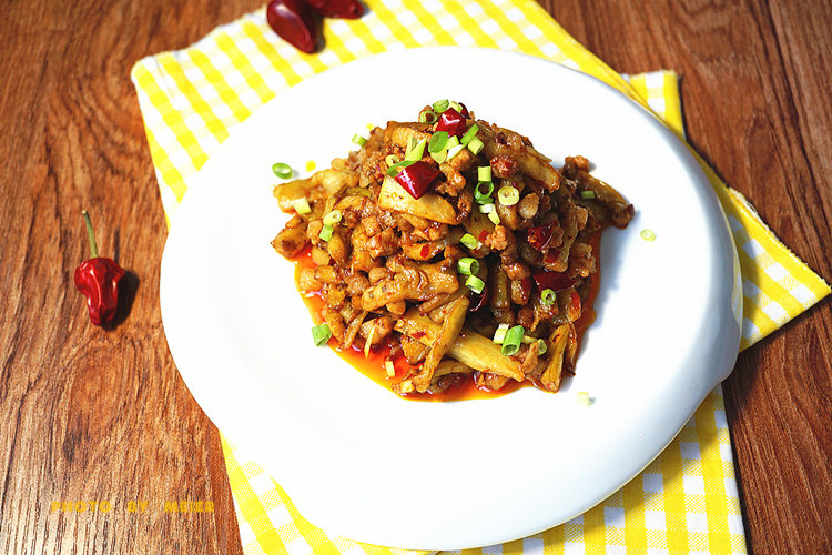 2:茄子去皮切手指粗细的长条状,准备猪肉末适量(忘记拍照)。