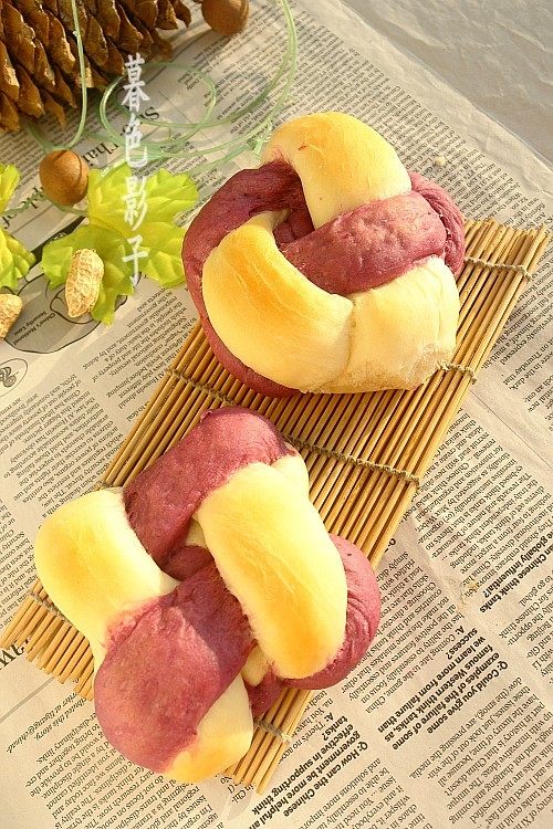 1:先将面粉一分为二,本色面团:温水化开2g酵母,加入到面粉中,根据自己喜欢的甜度加入适量的糖,拌到无干粉,揉成面团。紫薯蒸熟,压成紫薯泥,加入面粉中,再加入适量的温水溶解2g酵母,加入适量的糖,揉成面团。分别放入盆中,盖上保鲜膜自然发酵。