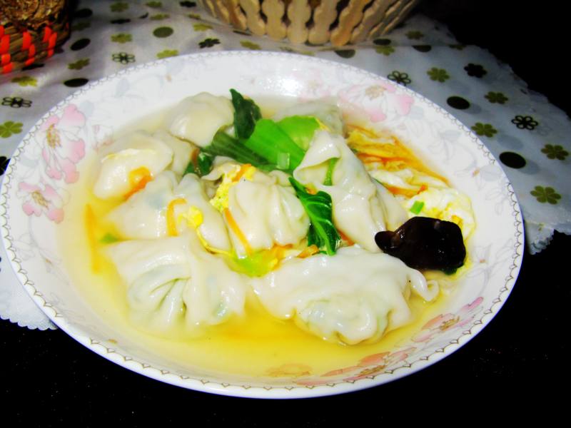 7:水开放入葱花、紫菜、盐、鸡精,熟虾,下入馄饨煮熟,出锅放香油,香菜。