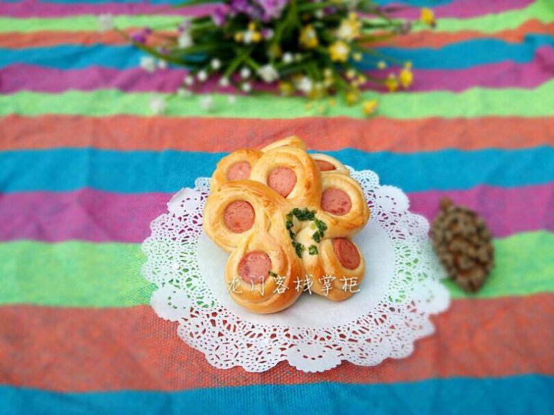 16:环中环花朵面包包法:由上而下将香肠卷起来,收口捏紧。