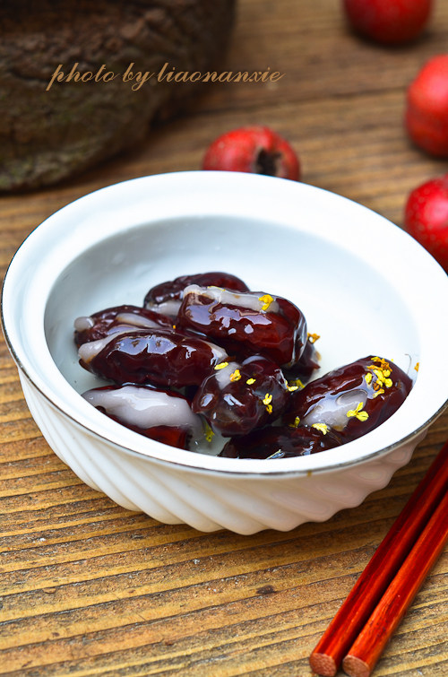 枣子去核时动作要轻,避免将枣子分成两半,不容易酿入糯米面。除了用蒸的方法外,还可以将酿好的枣码在砂锅中,加适量的水小火煮熟。桂花也可以放在糖水中稍煮一下,味道更浓。