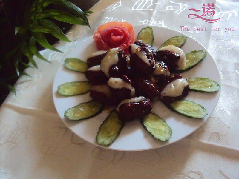 6:把小面团逐一酿入枣子中间,摆在盘中。