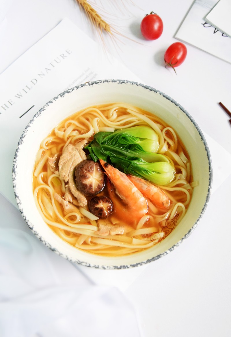鲜虾6只;香菇3只;瘦肉60克;青菜2颗;挂面90克;
