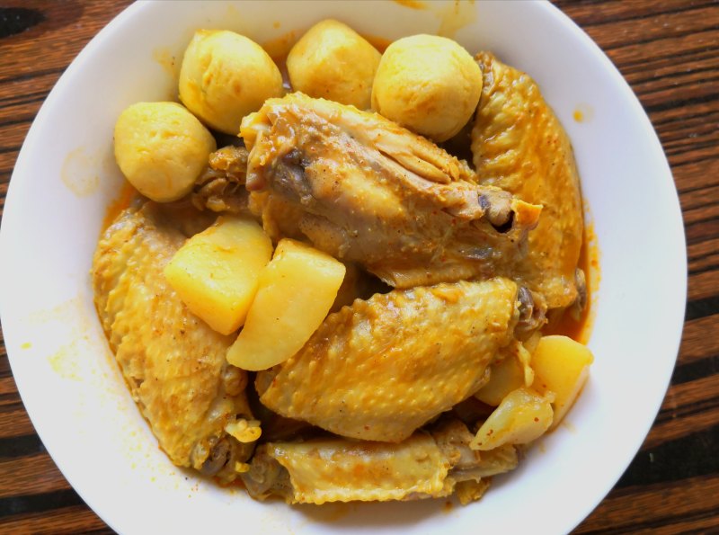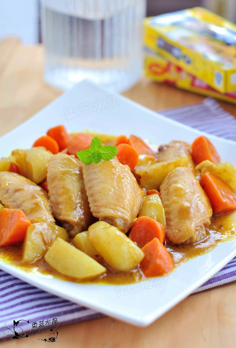1:食材:菜芯(已清洗)、鸡翅(已清洗)、姜片、咖喱块