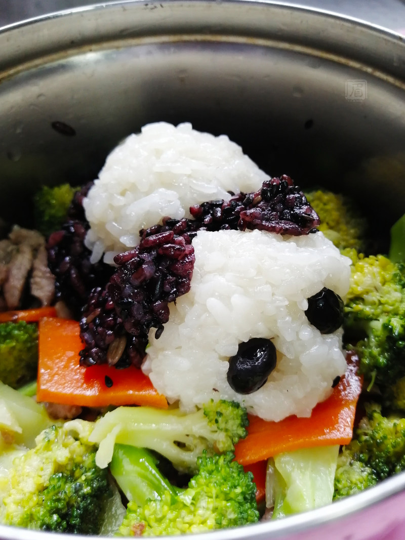 1.可以直接用黑米代替杂粮米,颜色更纯。2.菜谱中熊猫眼睛是用黑豆做的,如果用黑米代替杂粮米或者你的杂粮米中没有黑豆,可直接捏两个黑色小饭团代替,也可以蒸黑米饭时放几颗黑豆。