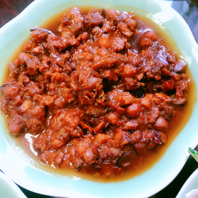 1:鹰嘴豆浸泡两小时,用电饭锅煮饭程序煮熟,牛肉、香菇、笋干切丁