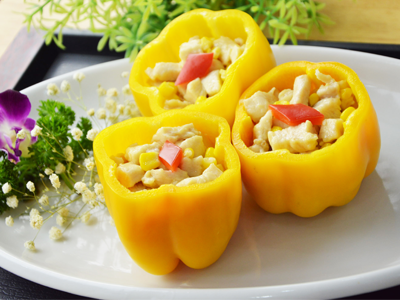 7:将彩椒放入装盘.将炒好的鸡丁放入彩椒中即可