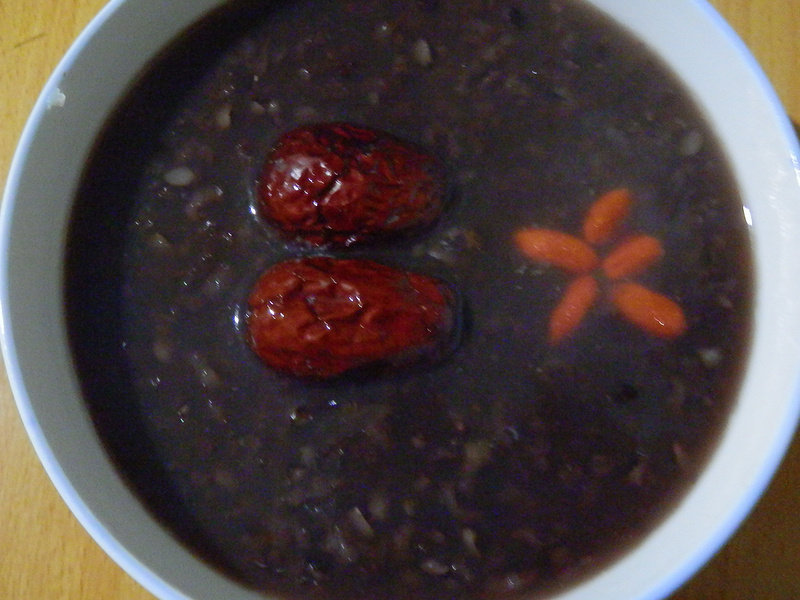 5:把泡好的米和洗好的大枣一起入锅,加入适量的清水煮,煮到米软糯时就好了,出锅前加入泡好枸杞。