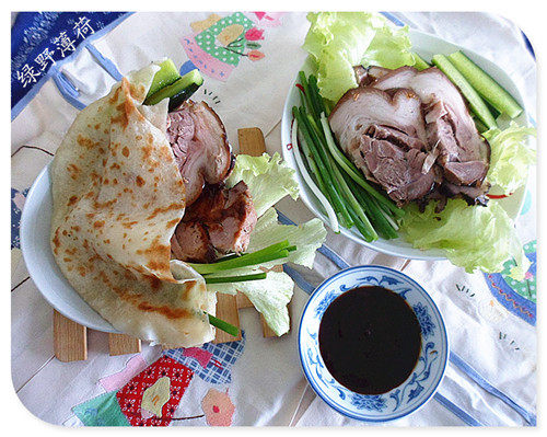 16:热饼加上肘子,香葱黄瓜生菜(根据个人喜好任意添加蔬菜),抹上甜面酱即可。