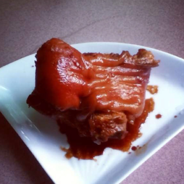 2:去骨的猪肘子加甜面酱料酒腌制。