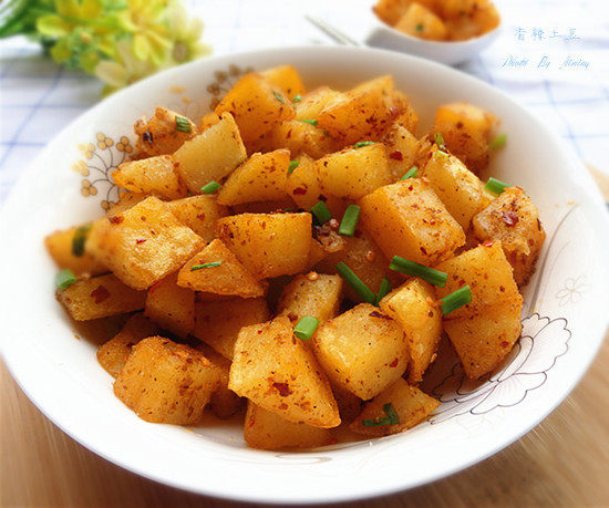 4:控干油的锅继续加温,土豆块倒进锅里,加盐,麻辣鲜,香葱,颠簸均匀出锅。