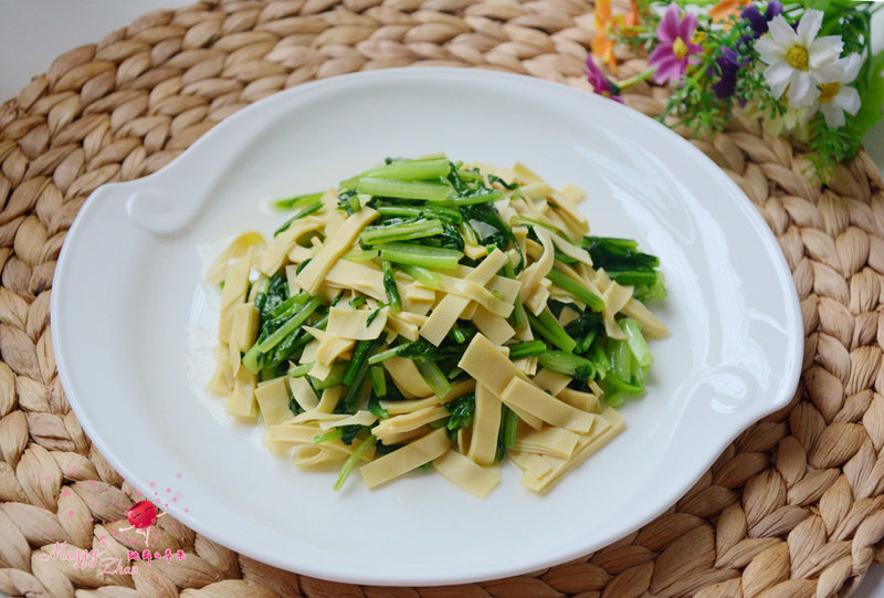 1.小松菜极嫩,不要长时间炒;2.豆腐皮切得细一些,也要入锅后快速翻炒出锅。