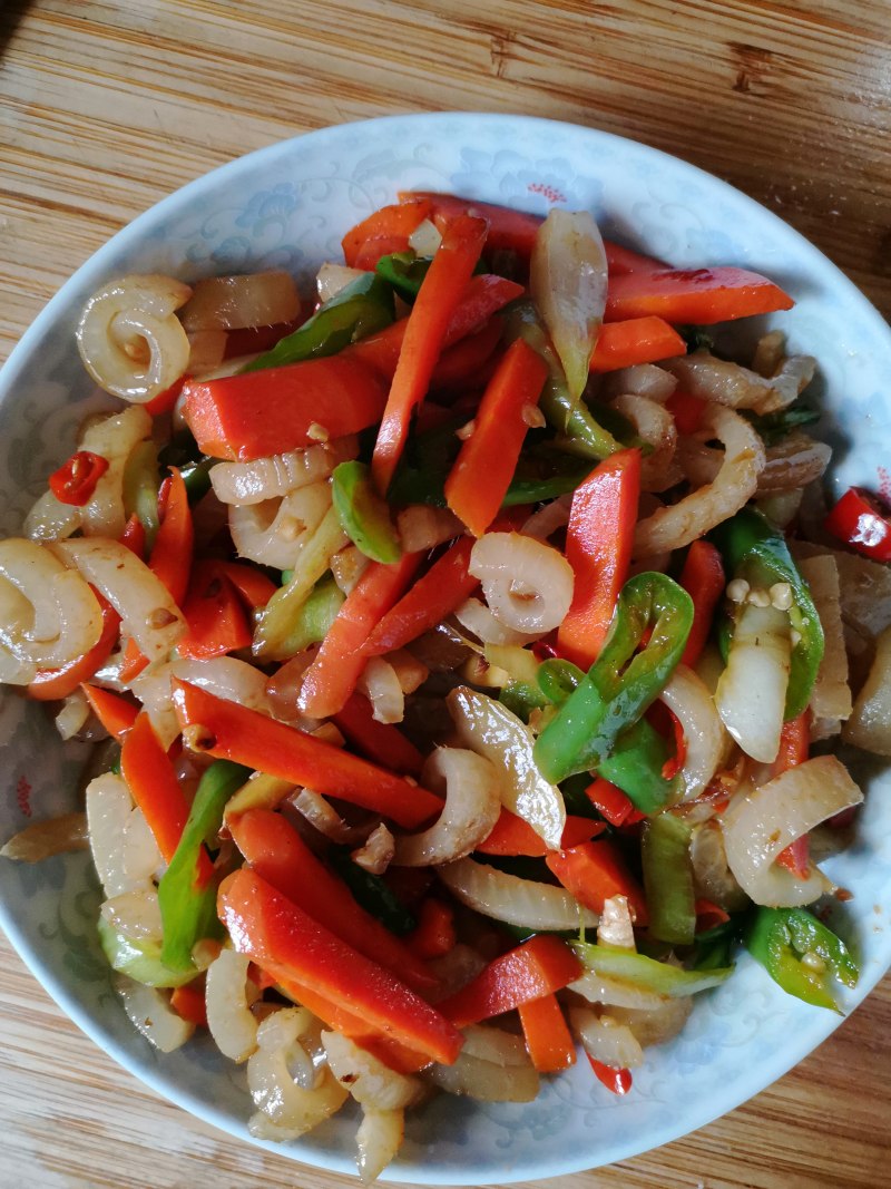 5:加酱油,盐,干辣椒,鸡精,翻炒几分钟,炒熟即可。