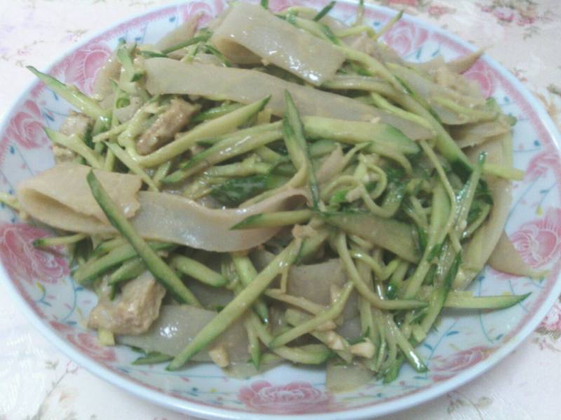 1:青笋切丝,干油豆腐皮冷水泡软。蒜切片。