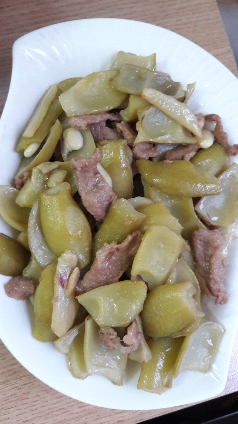 7:肉熟或者七八分熟把狗儿豆放下来,加盐生抽,白糖一起炒匀,炒到肉熟透。