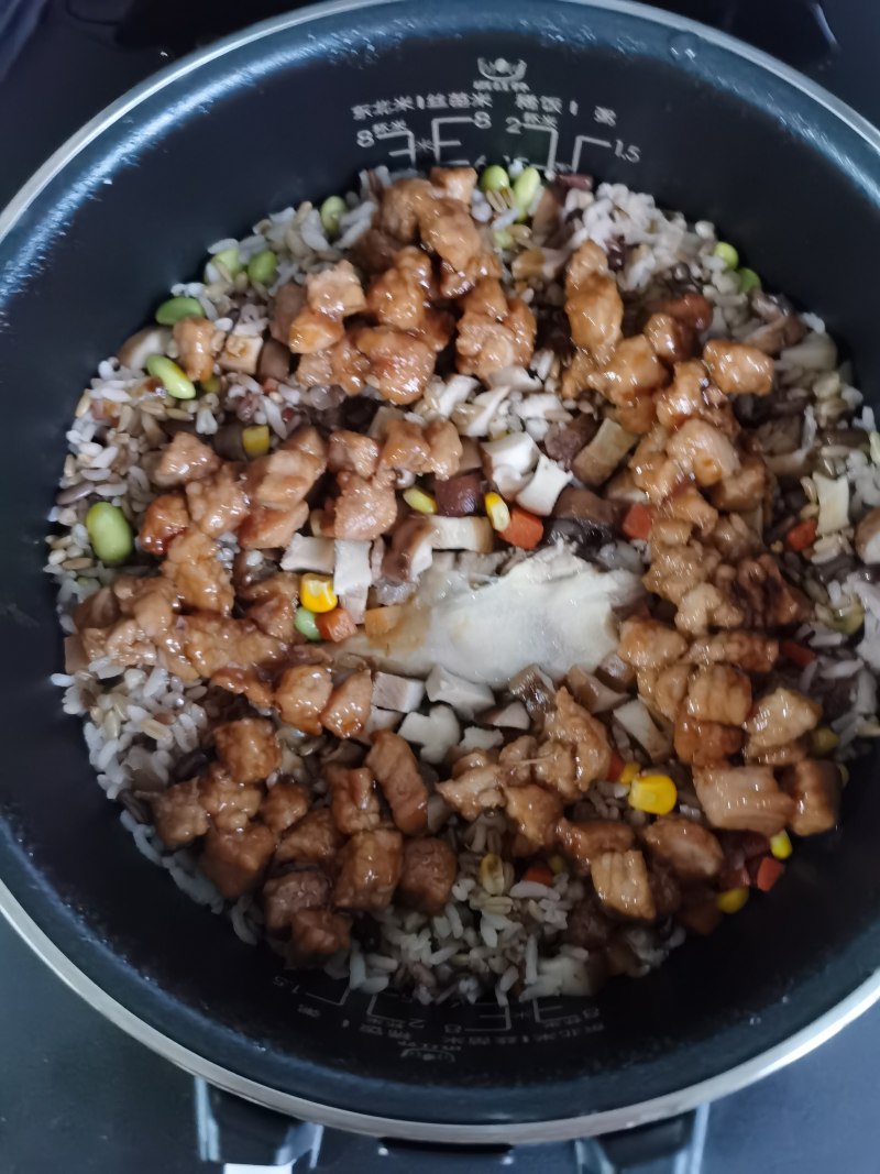 2:猪瘦肉切丁,(放生抽、老抽、白胡椒粉、生粉)香菇切丁,速冻蔬菜丁,毛豆。蔬菜先铺在米饭面上,煮十分钟中后放入猪瘦肉。