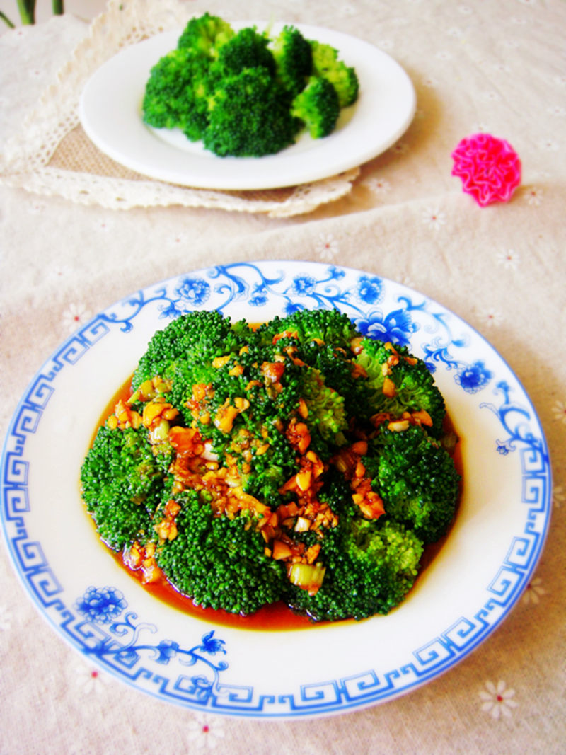 2:小米辣切圈,蒜切瓣,放在淖熟的西兰花上,再放芝麻,盐,糖,鸡精。