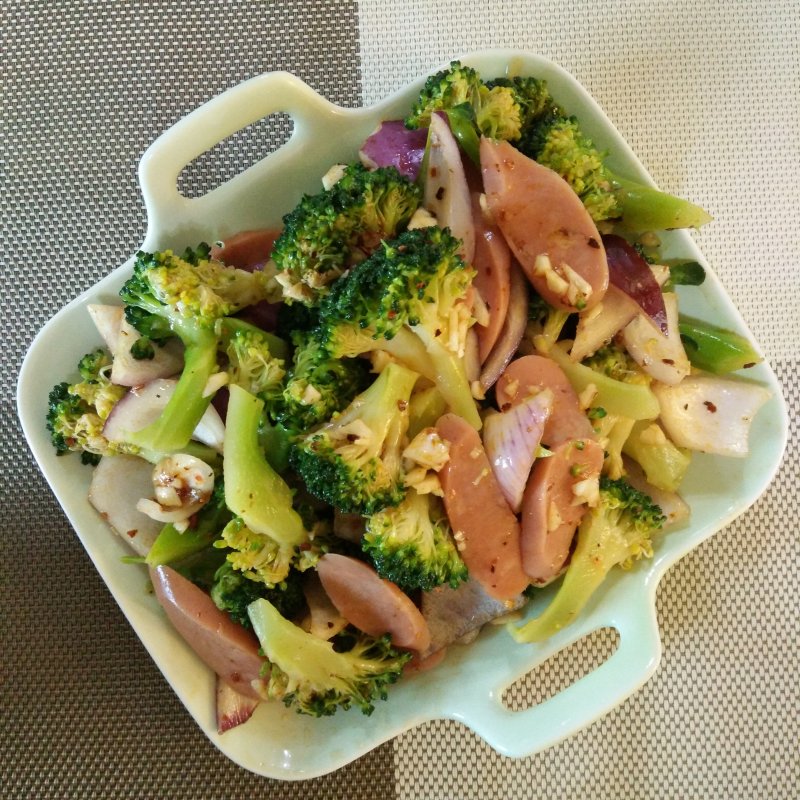 西兰花1颗;火腿肠1根;圆葱一些;蒜末适量;