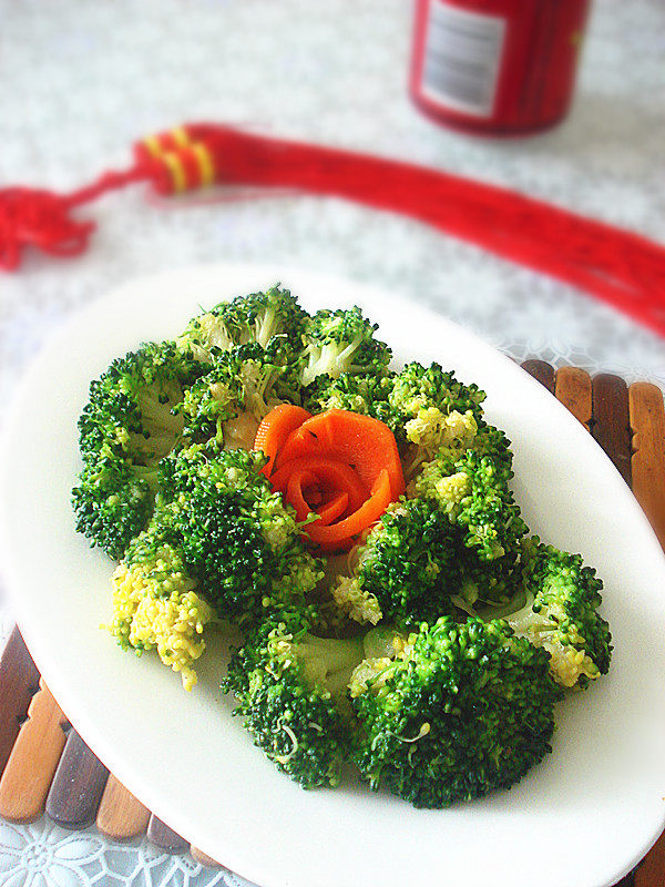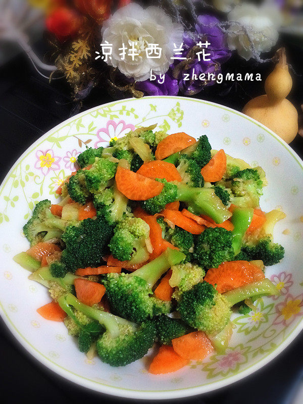 2:将沥干水分的西兰花和胡萝卜放入容器内加入适量的盐,醋,味精,耗油,拌好,装盘。