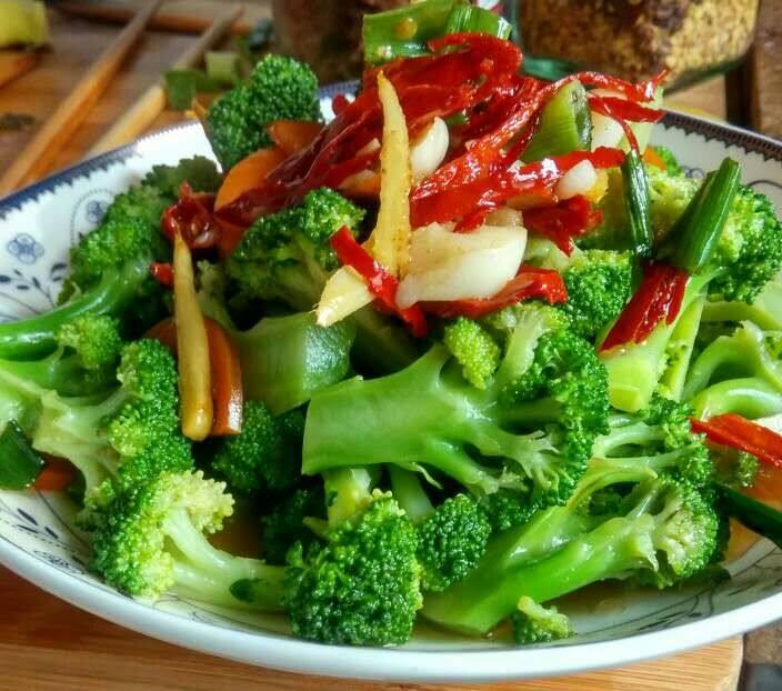 3:将植物油倒入锅内(油可以稍微多点),烧至8成开,放入辣椒,葱花,姜(切丝),蒜(切丁或片),炒出香味连油一起浇在装好盘的西兰花上面即可。