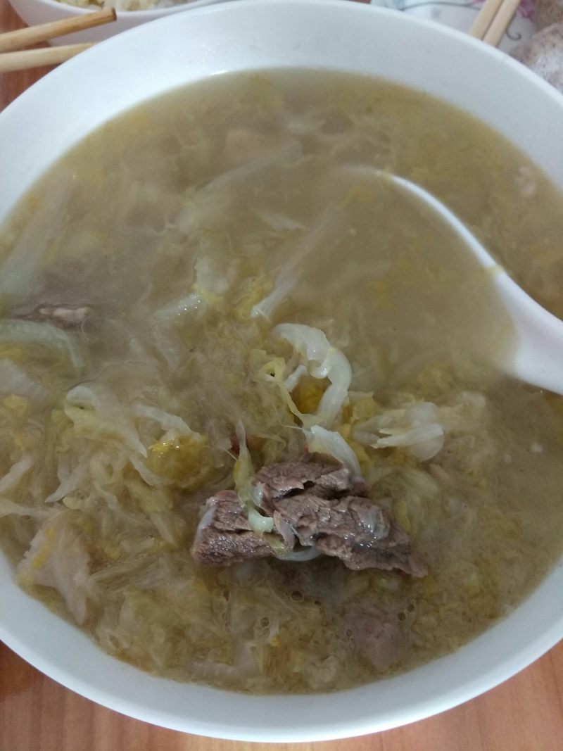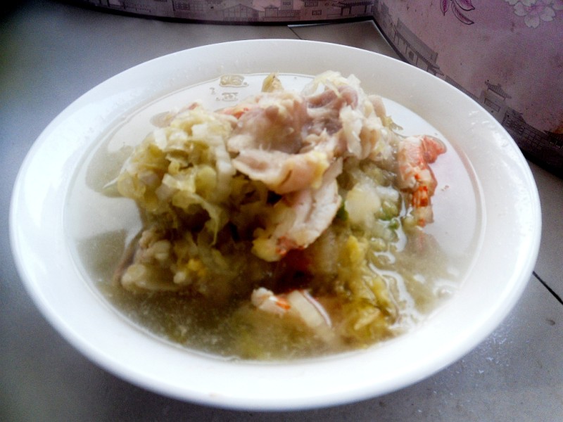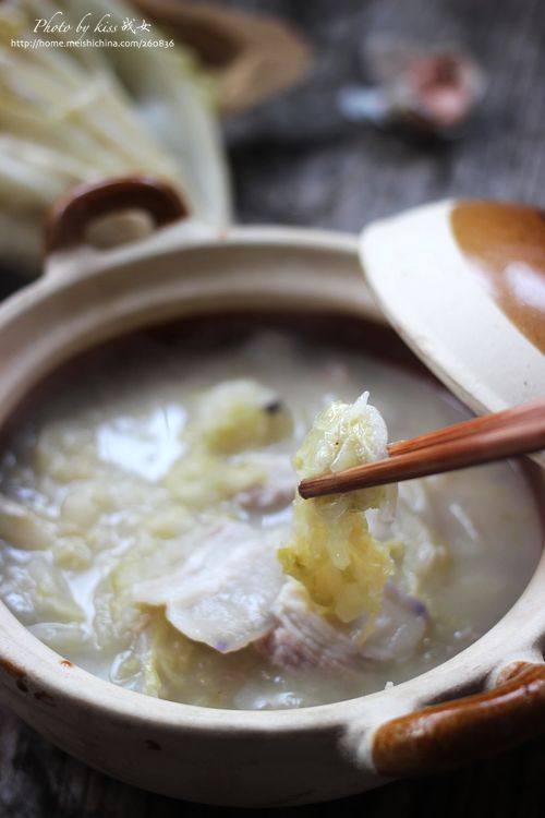 6:放入酸菜,炖到酸菜软烂,加入盐,鸡精出锅。菜软汤鲜。吃的时侯加点韭菜花。