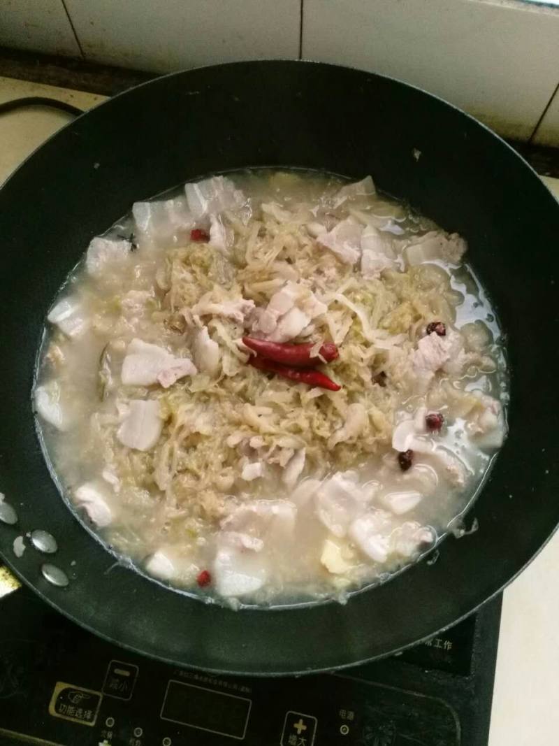 4:加入适量的水,喜欢喝汤就多加点水,大火烧开,酸菜炖熟。