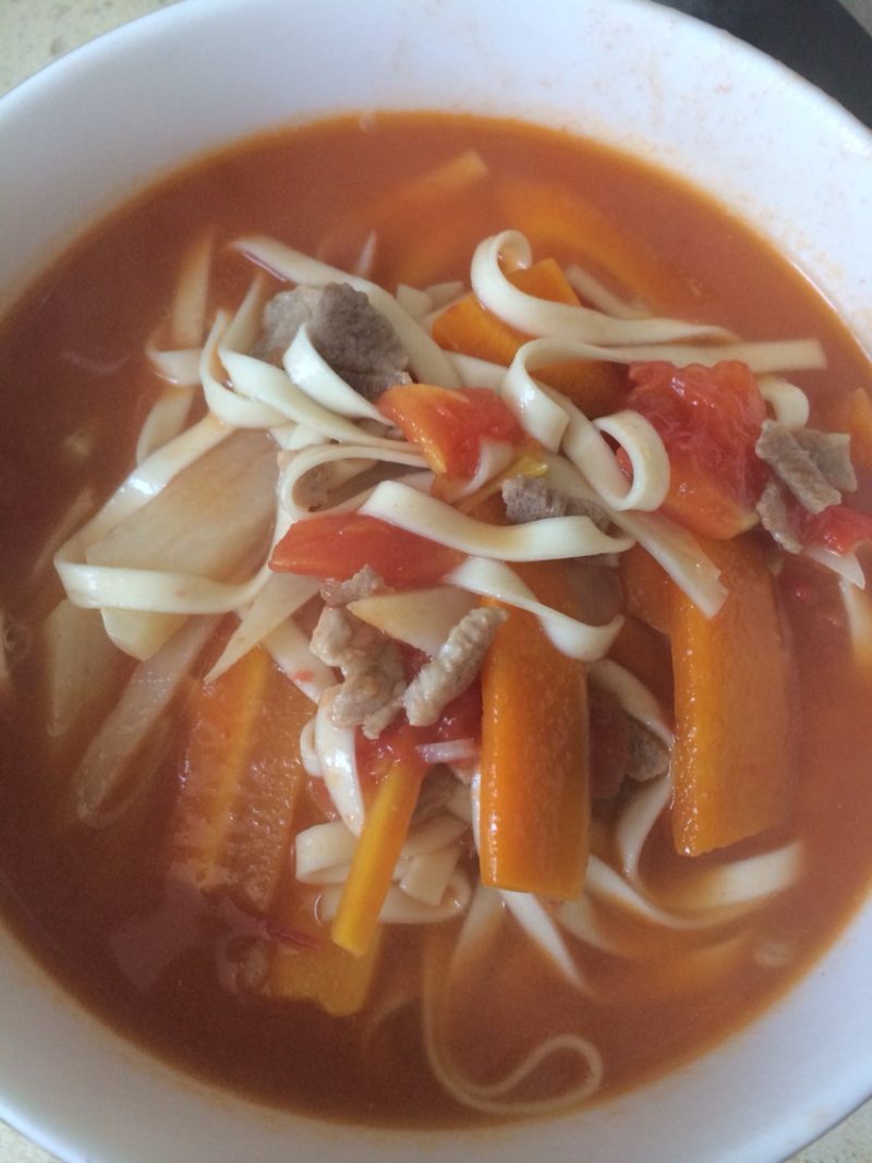面条适量;西红柿2个;猪肉末100克;土豆1个;胡萝卜1个;