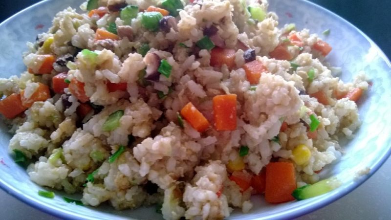 2:剩米饭加热(微波、蒸锅都可以)拌入丘比沙拉酱