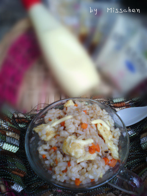 2:鸡蛋打进碗里加点盐打散,胡萝卜切碎,挤一勺沙拉酱到米饭里拌匀