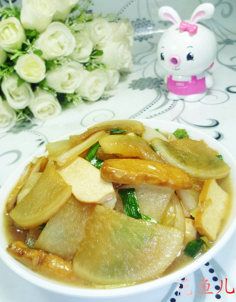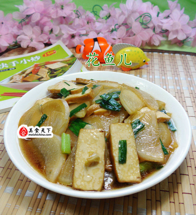 1:材料:萝卜(已清洗切成片)、香干(已切成片)、蒜段