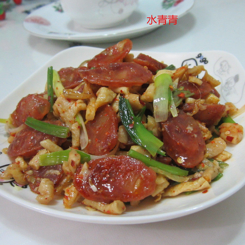 2:干萝卜条泡软切碎,香肠切片,芹菜切段。