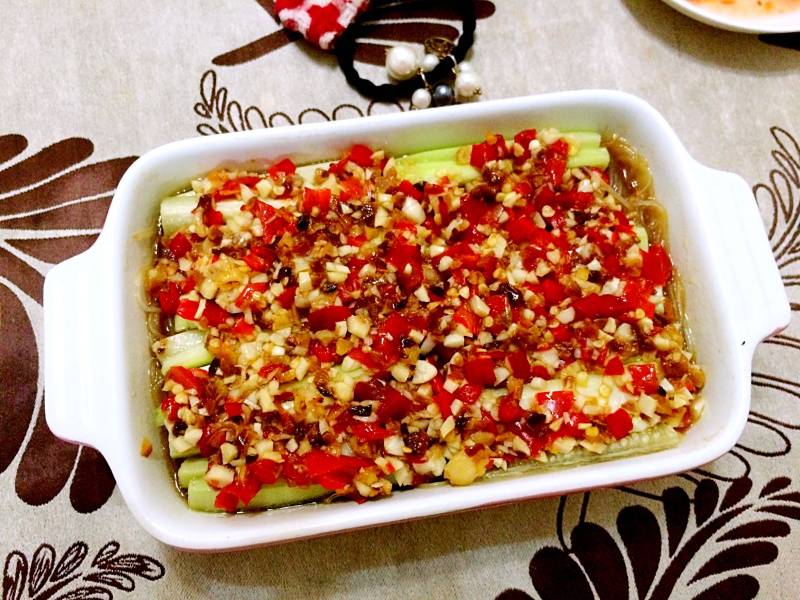 9:蒸好出锅,颜色红绿相间,口感清爽鲜美。