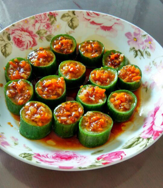9:将炸好的蒜蓉放入,将装好蒜蓉的丝瓜段摆在盘中,将胡萝卜末放在蒜蓉上