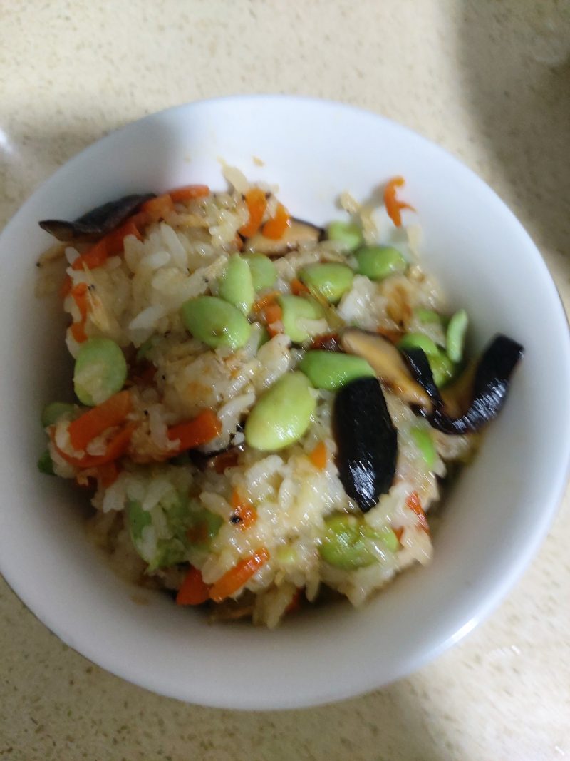 毛豆米适量;胡萝卜一条;香菇适量;虾皮适量;盐适量;生抽适量;黑胡椒粉适量;