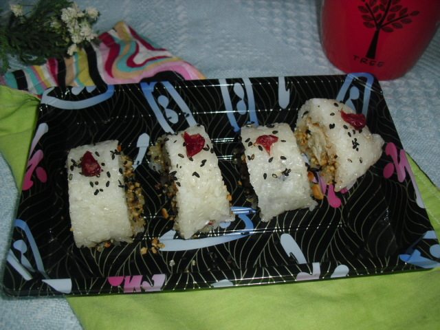 1:糯米淘好,三杯米两杯水煮出来刚好。前一天晚上泡,第二天早上煮。