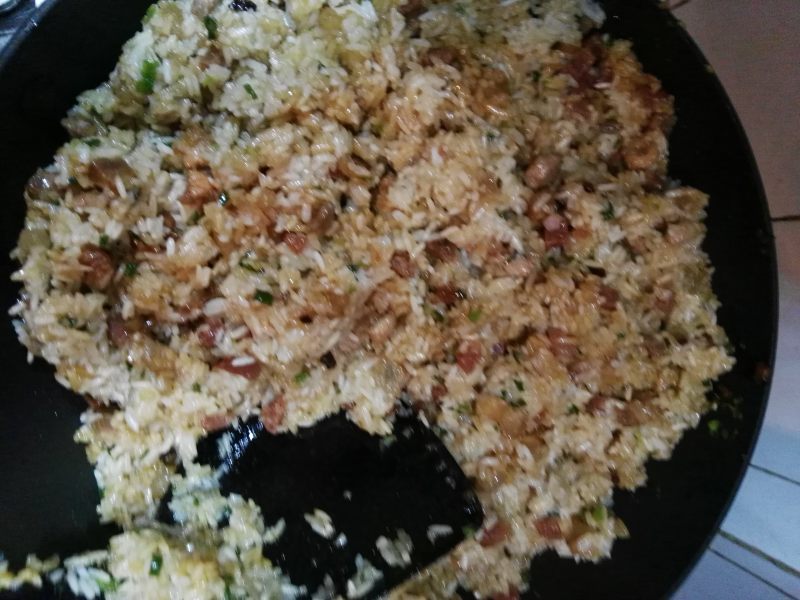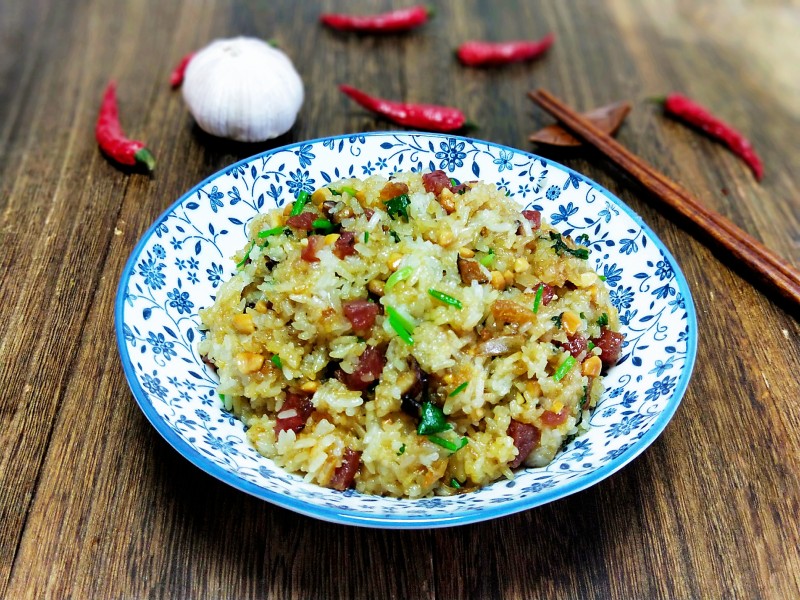 1.糯米不好消化,可以按3比1对一些粘米一起煮。2.猪肉要些肥肉,炒出来的油炒饭特别香。3.放酱油时可多放一些。4.还可以放些虾米、尤鱼、花生米去炒,我家的不喜欢吃虾米,所以没放。