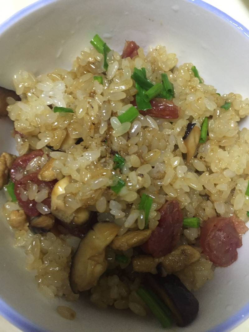 糯米两个量;腊肠两根;香菇3颗;虾仁适量;烤花生适量;